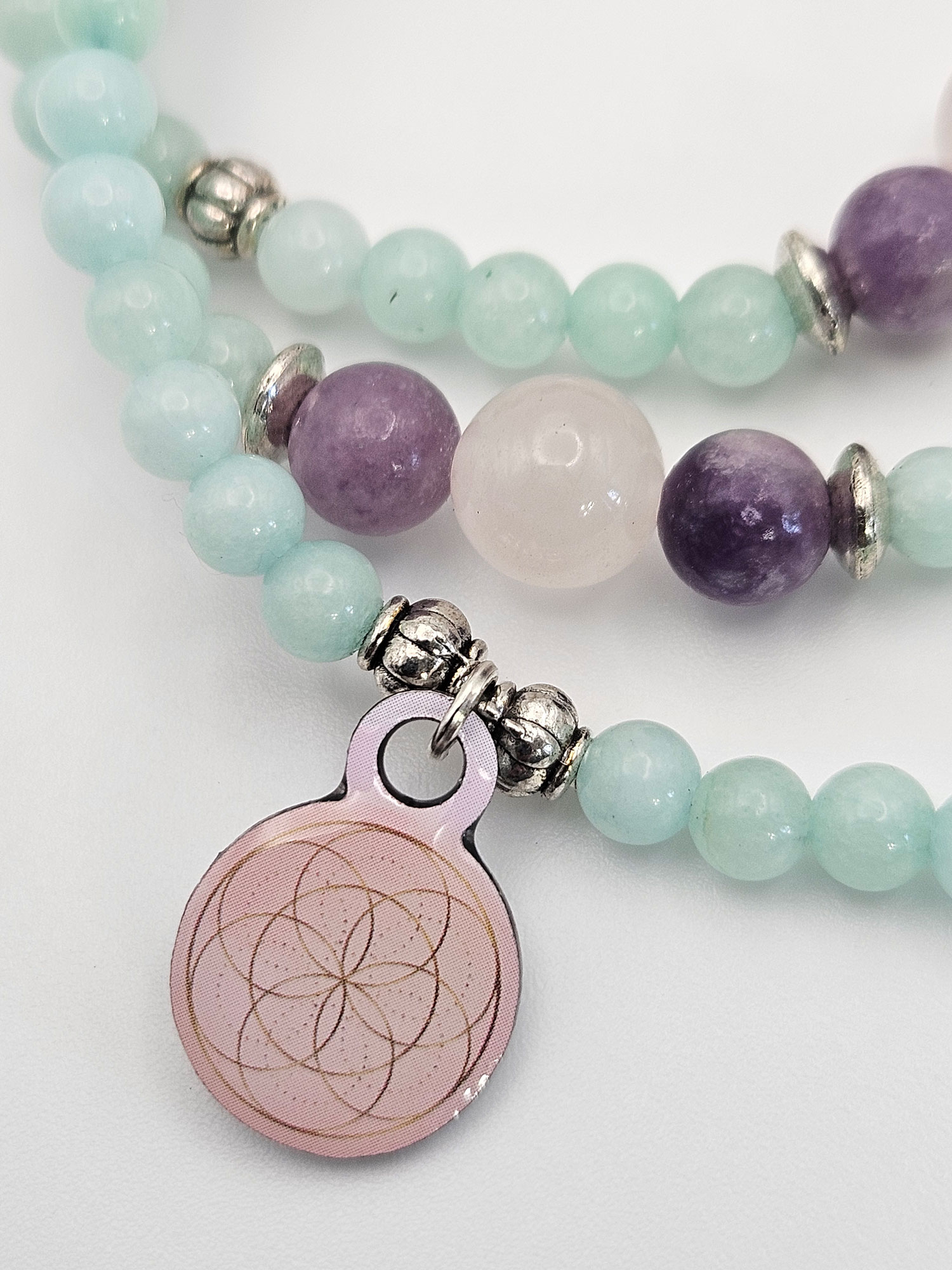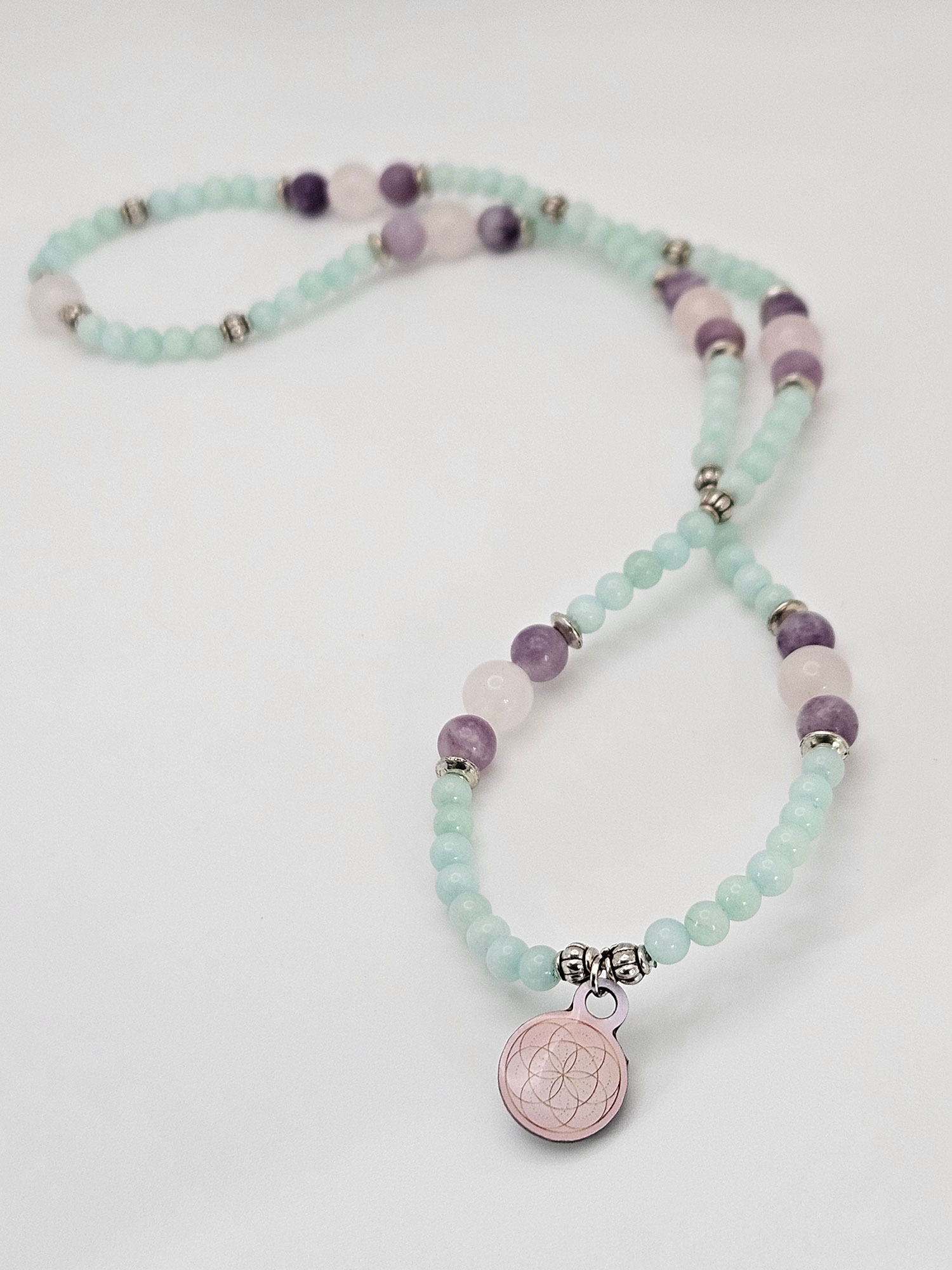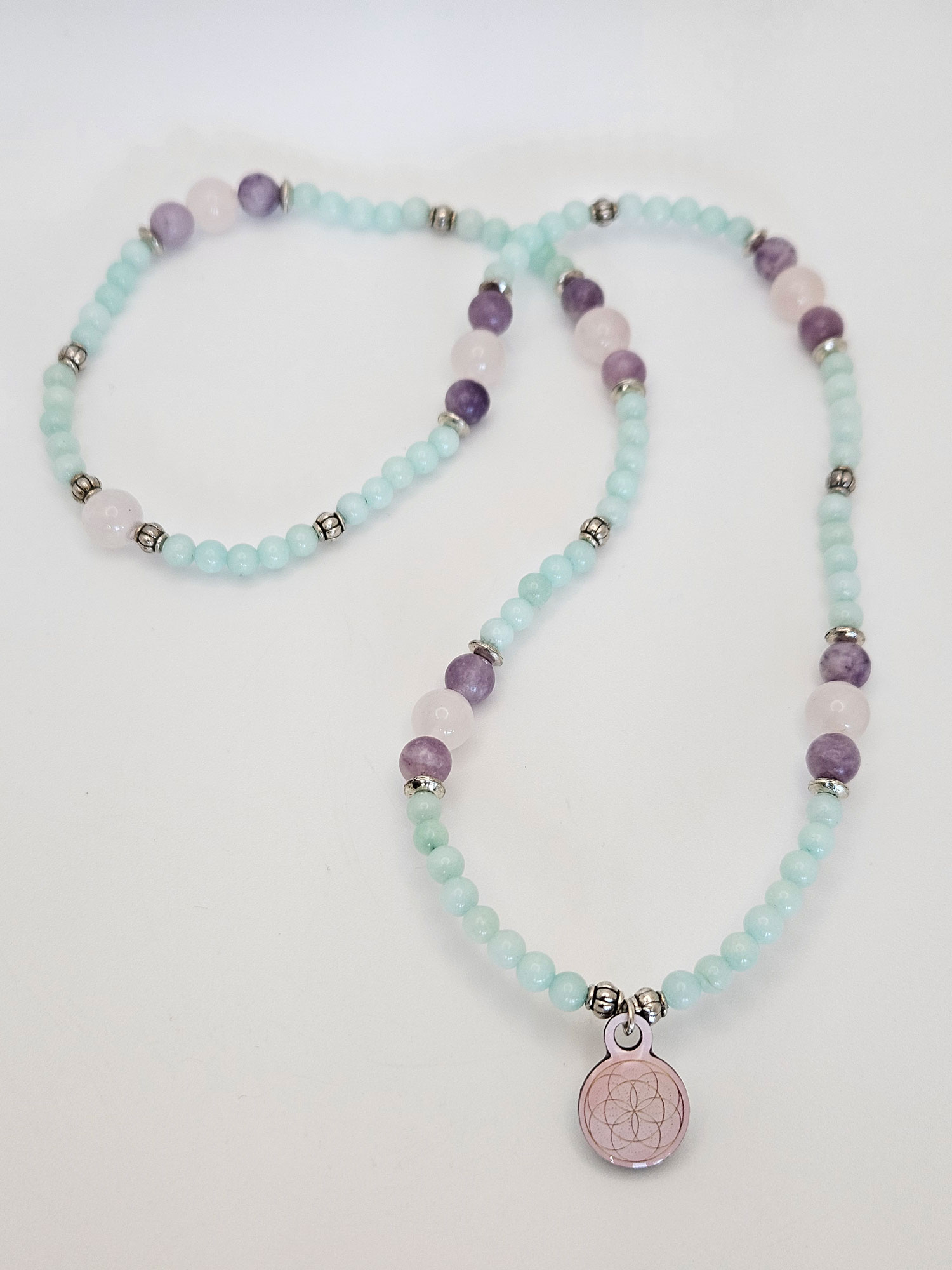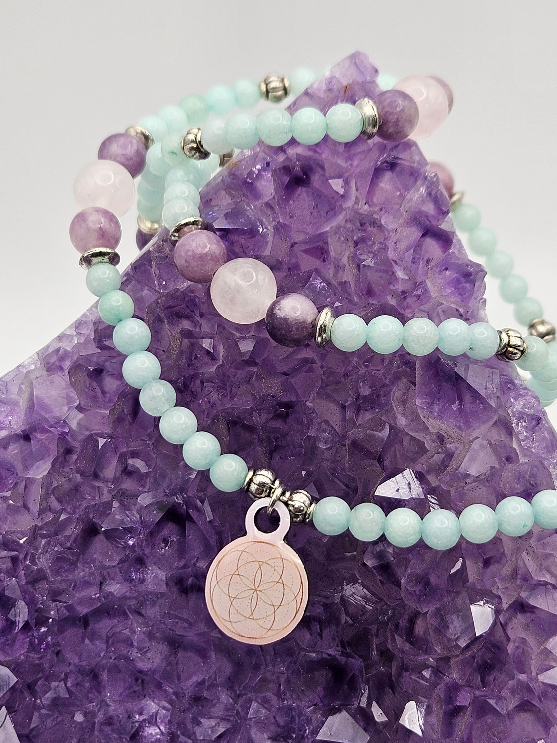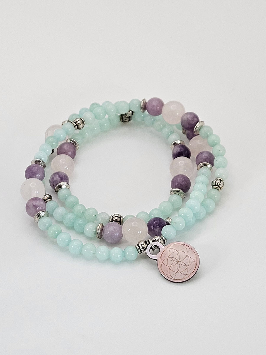 Aquamarine is the leading gemstone for this series because of its ability to increase our spiritual awareness in such a way that it reveals the beauty that exists in the Universe. While Aquamarine invokes higher states of consciousness it strongly harmonizes and calms. Assisting Aquamarine in this series is pink tourmaline and rose quartz, two stones that also vibrate the frequencies of harmony, beauty and love. These three stones are put together like a beautiful bouquet.