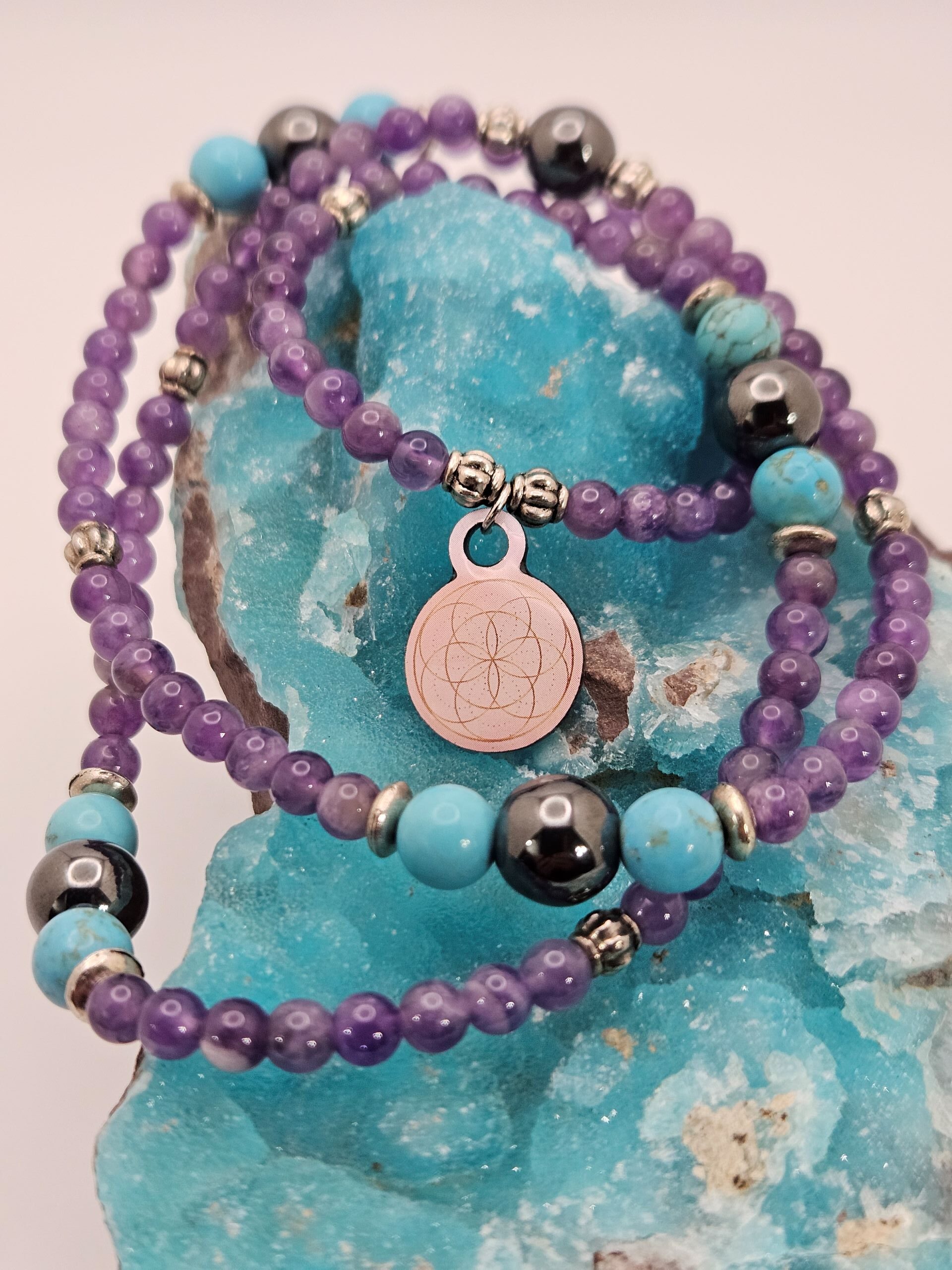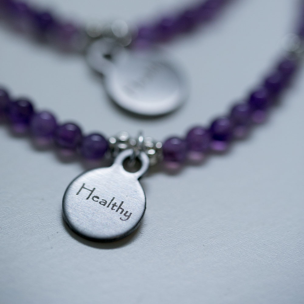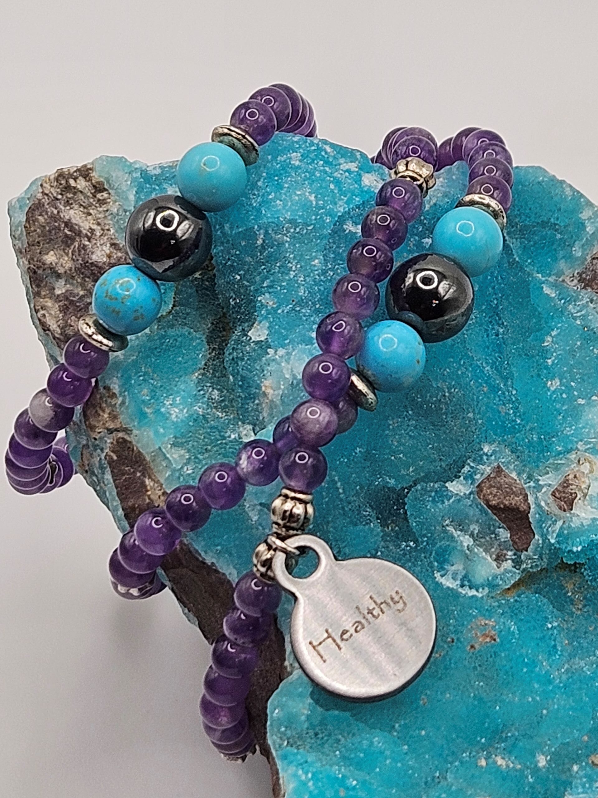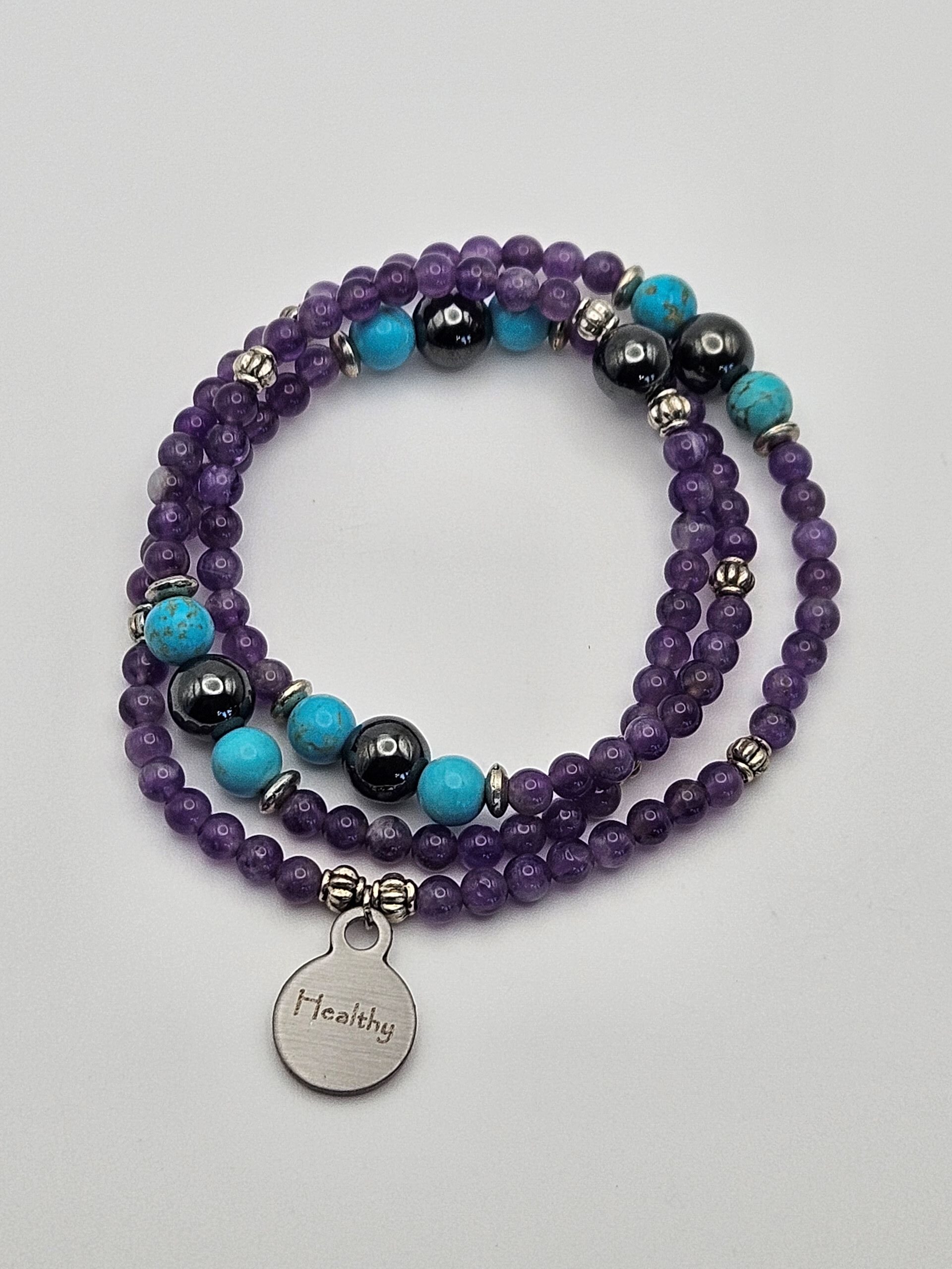 The gemstones that make up the You are Healthy series are Amethyst, Turquoise, and Hematite.