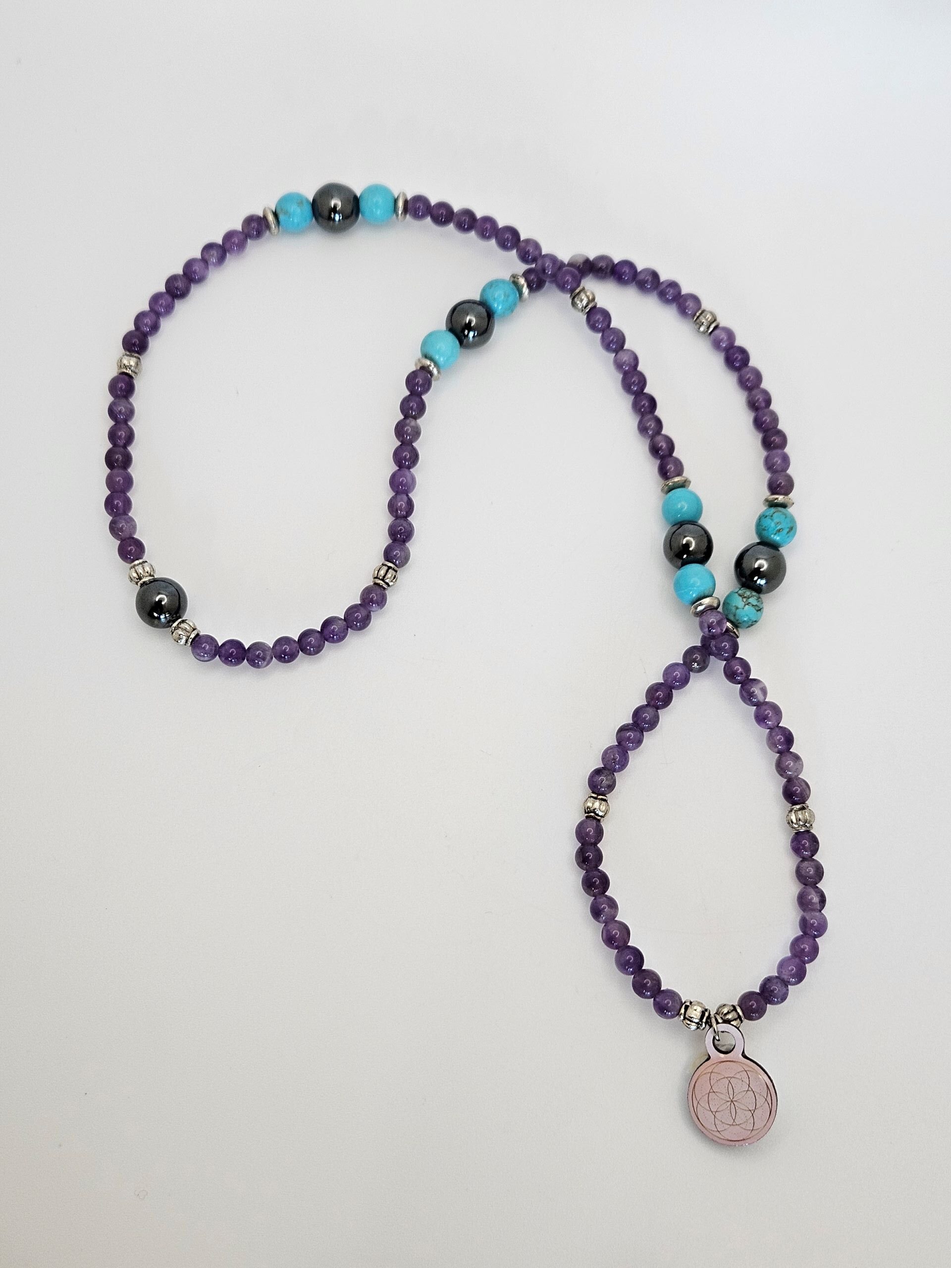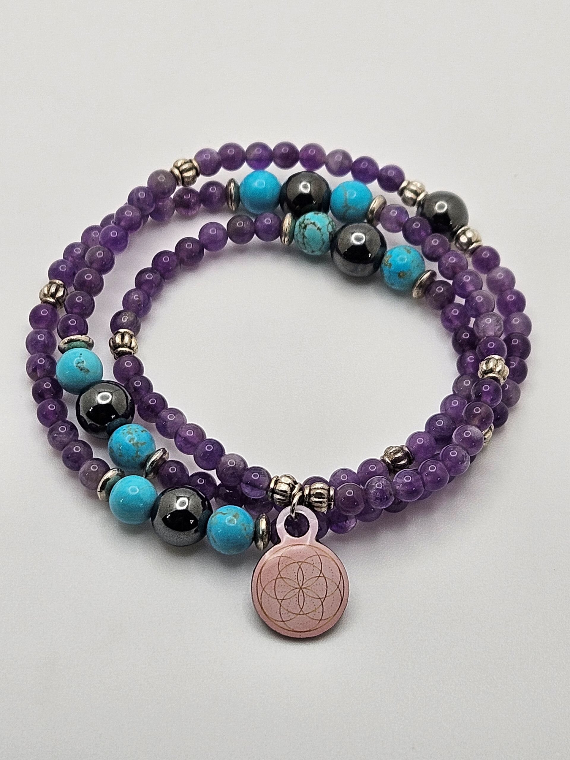 Amethyst is the leading gemstone for this series because it is one of the most powerful healing stone as it protects from harmful energies while centering, balancing calming our mind, body and spirit. Turquoise is an equally powerful healing gemstone and has been used by many cultures by shamans and medicine folk in rituals and healing practices. Hematite drawn toxins and negativity from our mind, body and spirit while providing additional grounding and protection.